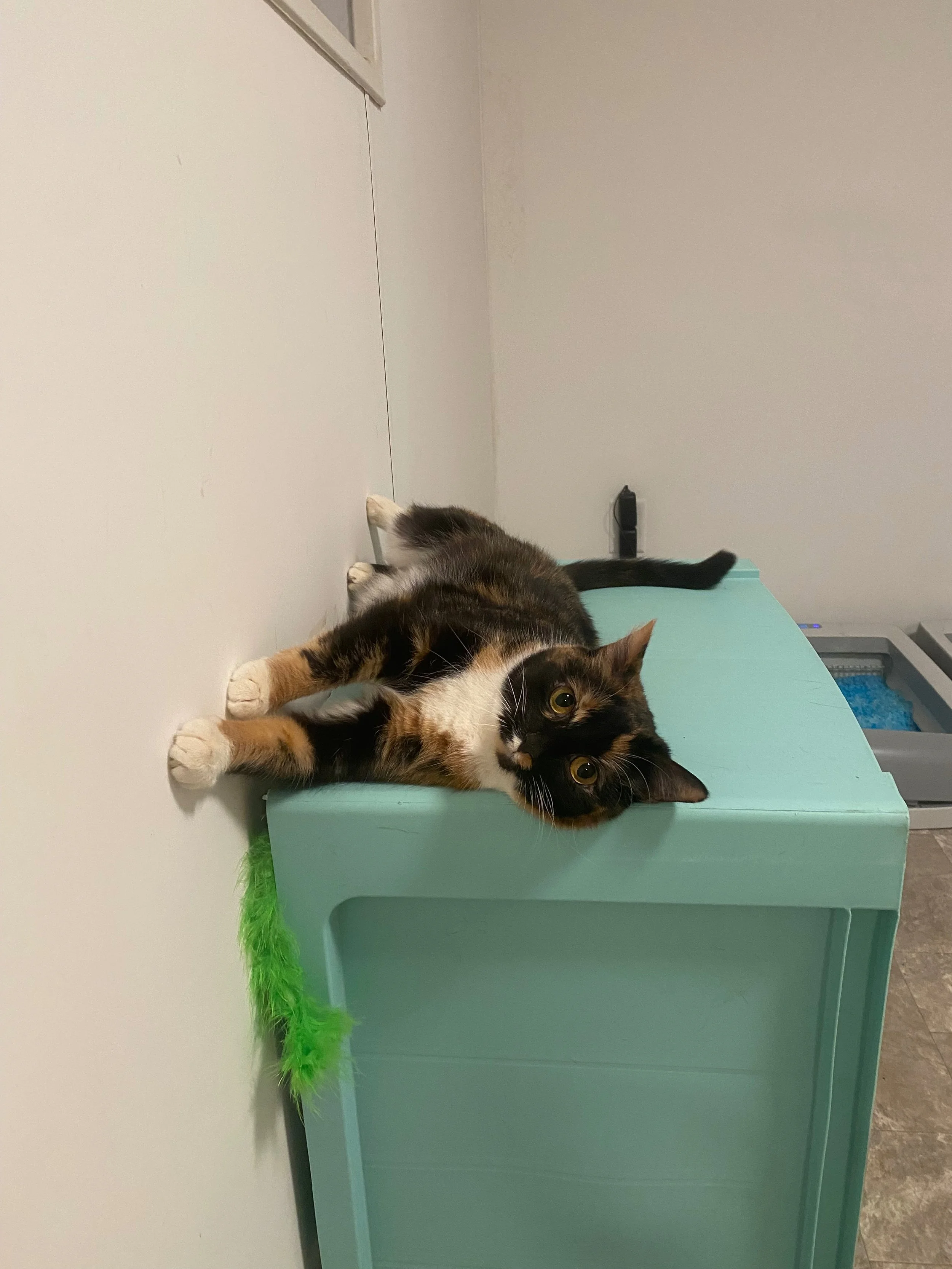 She was hiding on the hot asphalt under a truck, trying to get some shade. She was hungry, hot, sick with an upper respiratory infection, and infested with fleas! With some food, AC, medicine, and a bath, she recovered quickly and became a very playful little girl!? She has been fully vetted and spayed! Blood tests have shown that she is FIV positive. FIV can be a scary diagnosis if you are uninformed. Luckily, we have years of experience with FIV cats.
